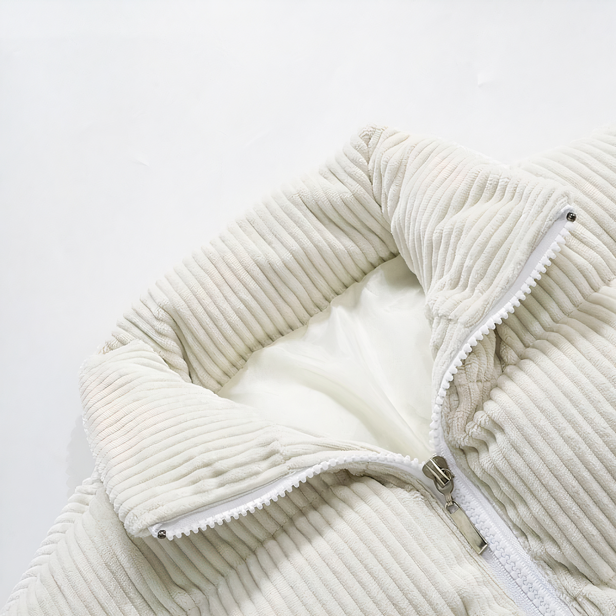 Questo piumino in velluto a coste beige unisce eleganza e calore. Realizzato con materiali morbidi, ha un look moderno grazie alla finitura a coste fluide.