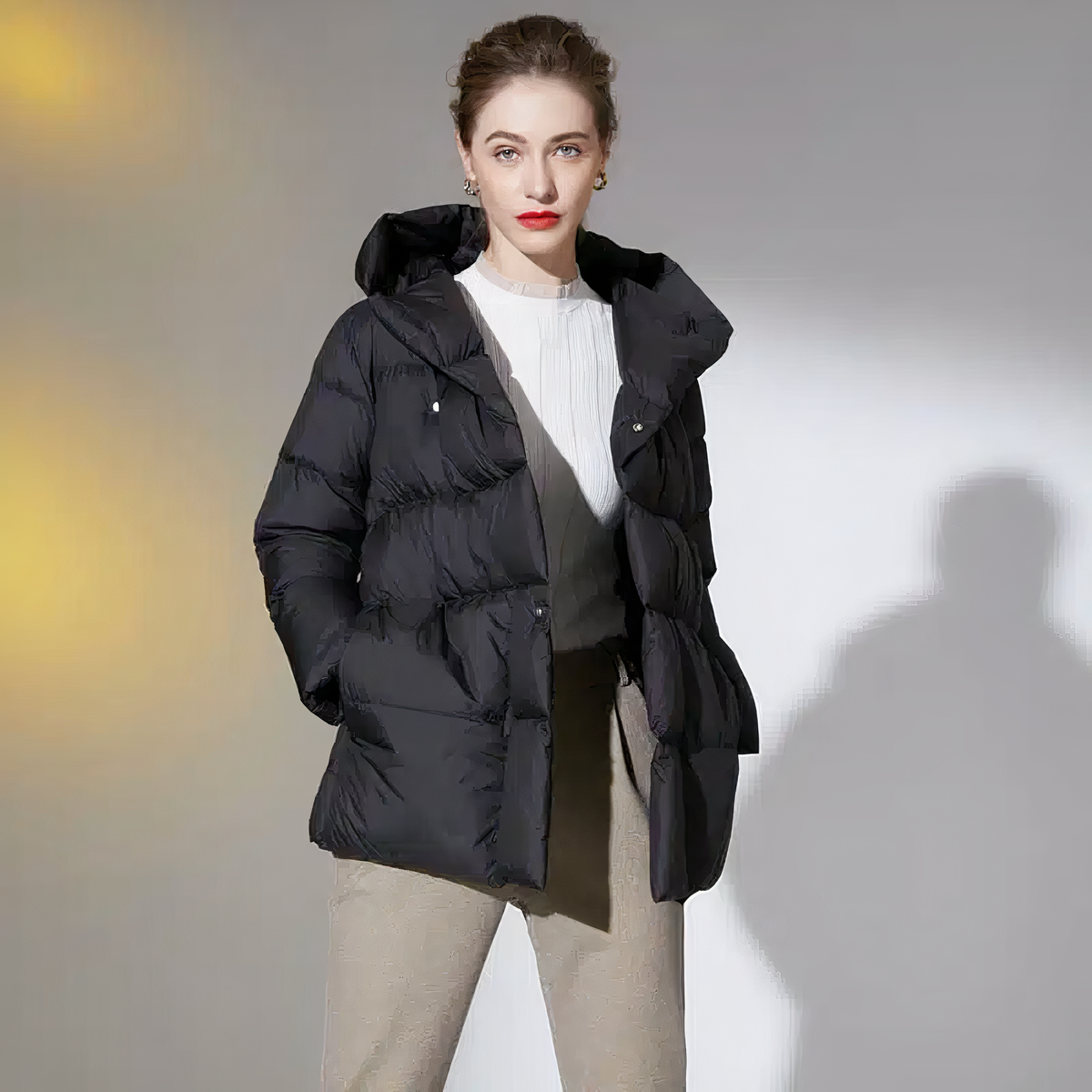 Questo piumino nero da donna di media lunghezza con cappuccio e cintura ha un design classico ed elegante. La giacca si chiude con bottoni a pressione e una cintura che si lega in vita.