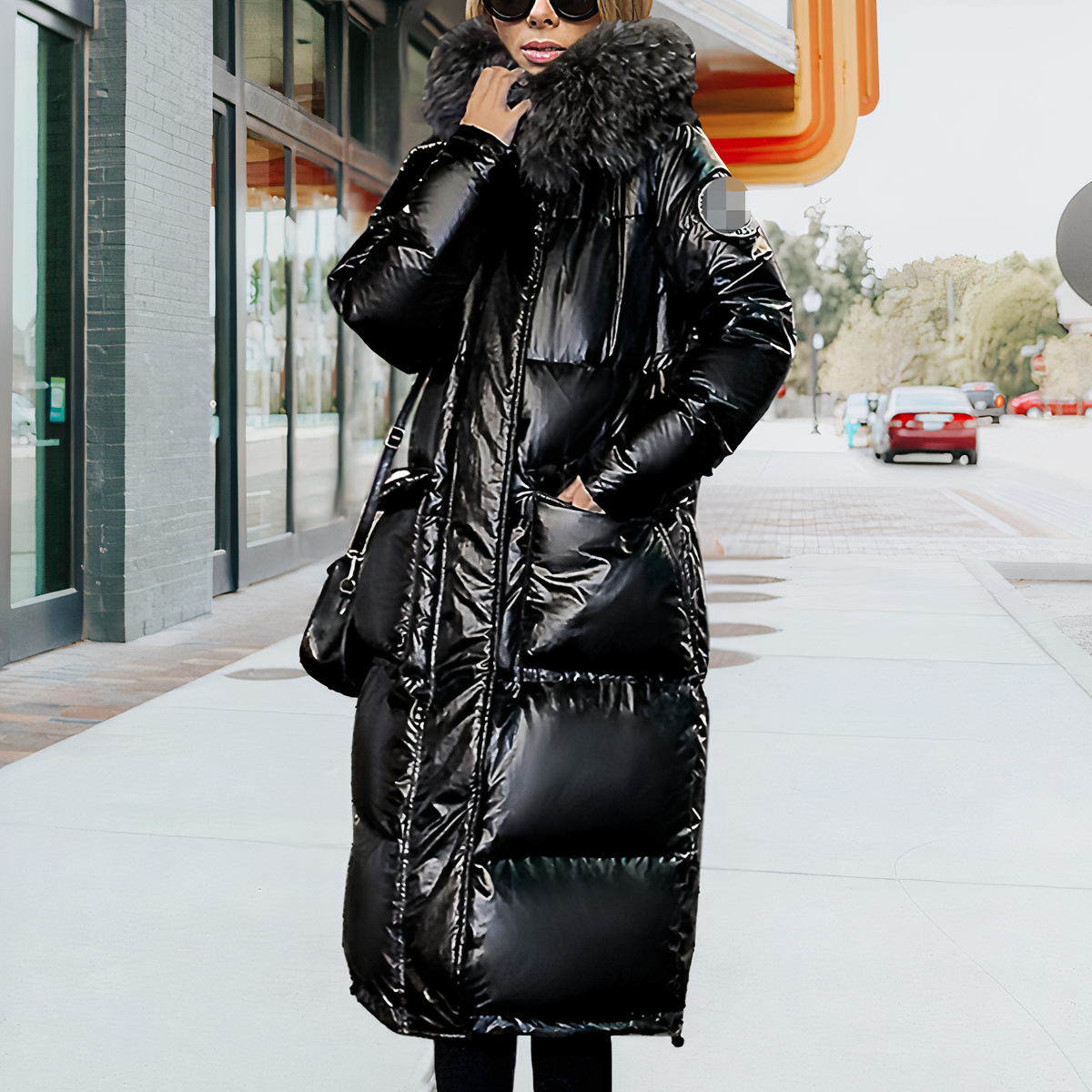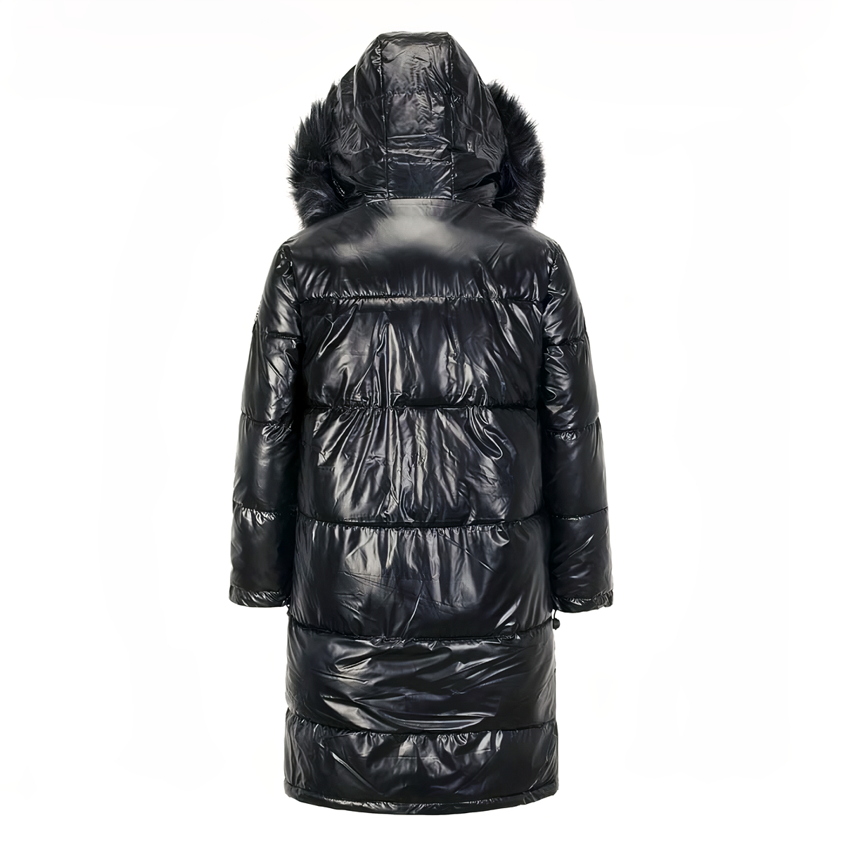 Il piumino nero lucido da donna di media lunghezza è un capo di abbigliamento invernale elegante e pratico. Realizzato con materiali di alta qualità, questo piumino è morbido al tatto e comodo da indossare. È dotato di una robusta cerniera per una protezione ottimale contro il freddo e il maltempo.