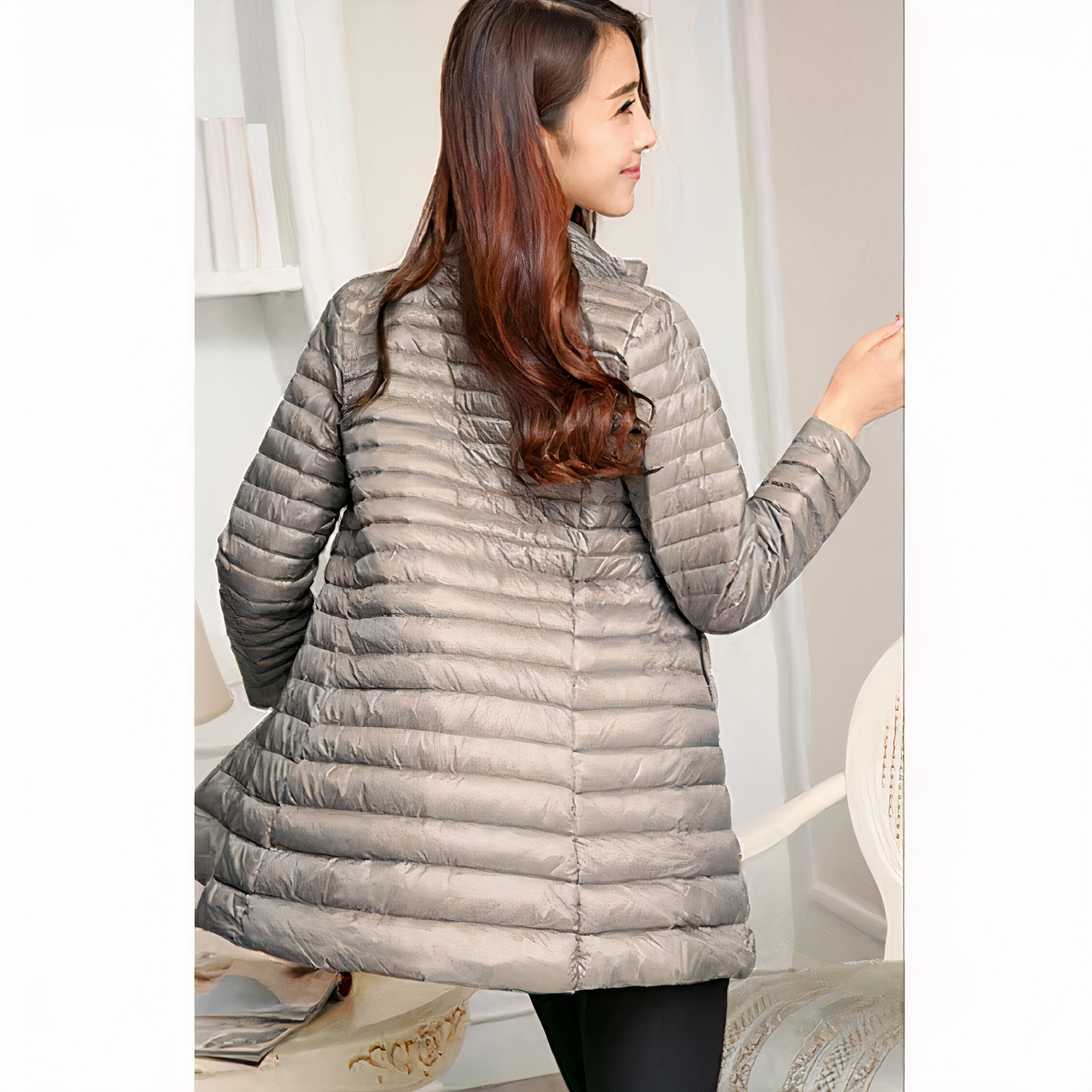 Il nostro piumino da donna di media lunghezza e vestibilità slim in grigio è proprio quello che fa per voi! Ha un collo alto per tenere fuori il freddo e una chiusura a zip per un maggiore comfort. Le tasche laterali sono comode per i vostri piccoli oggetti essenziali.