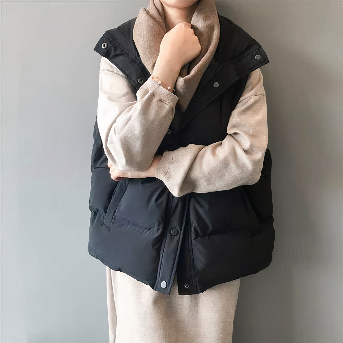 Il piumino nero senza maniche da donna è leggero e confortevole, perfetto per le giornate fredde. È realizzato in un tessuto spesso e resistente che vi terrà al caldo per tutto il giorno. Le tasche con chiusura a zip terranno al sicuro i vostri oggetti essenziali.