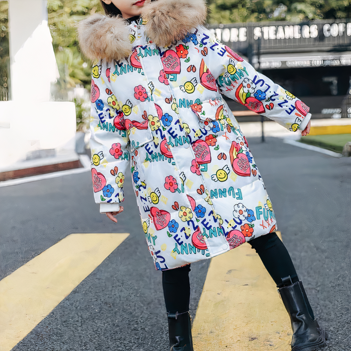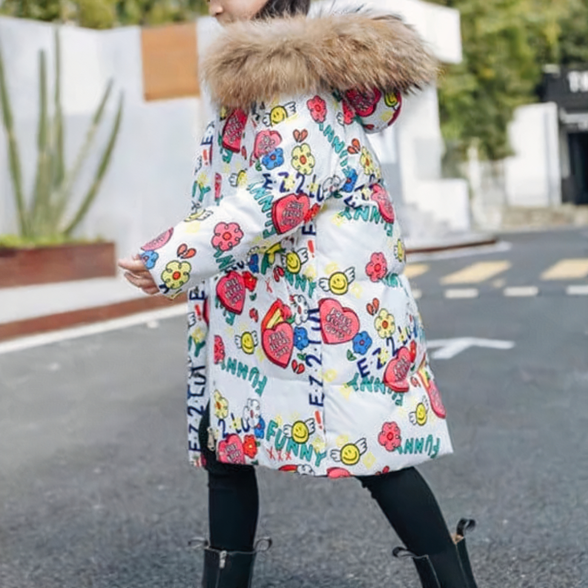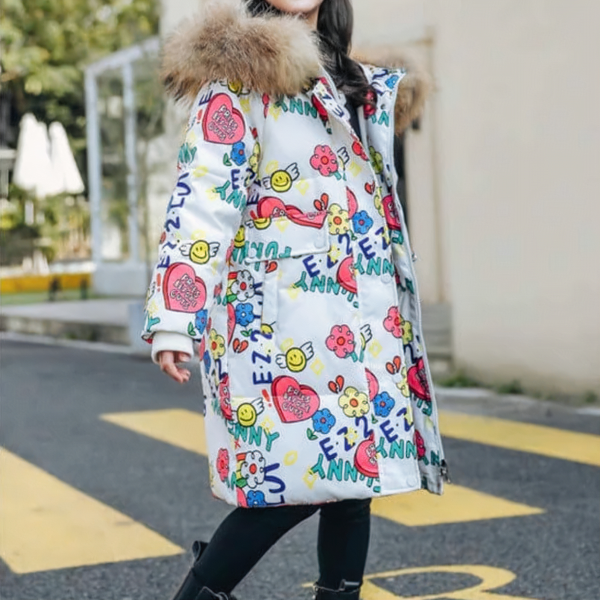 Questo è il piumino perfetto per l’inverno! È caldo, confortevole e super trendy con il suo motivo bianco colorato, il design chic, il tocco di divertimento e il cappuccio di pelliccia.