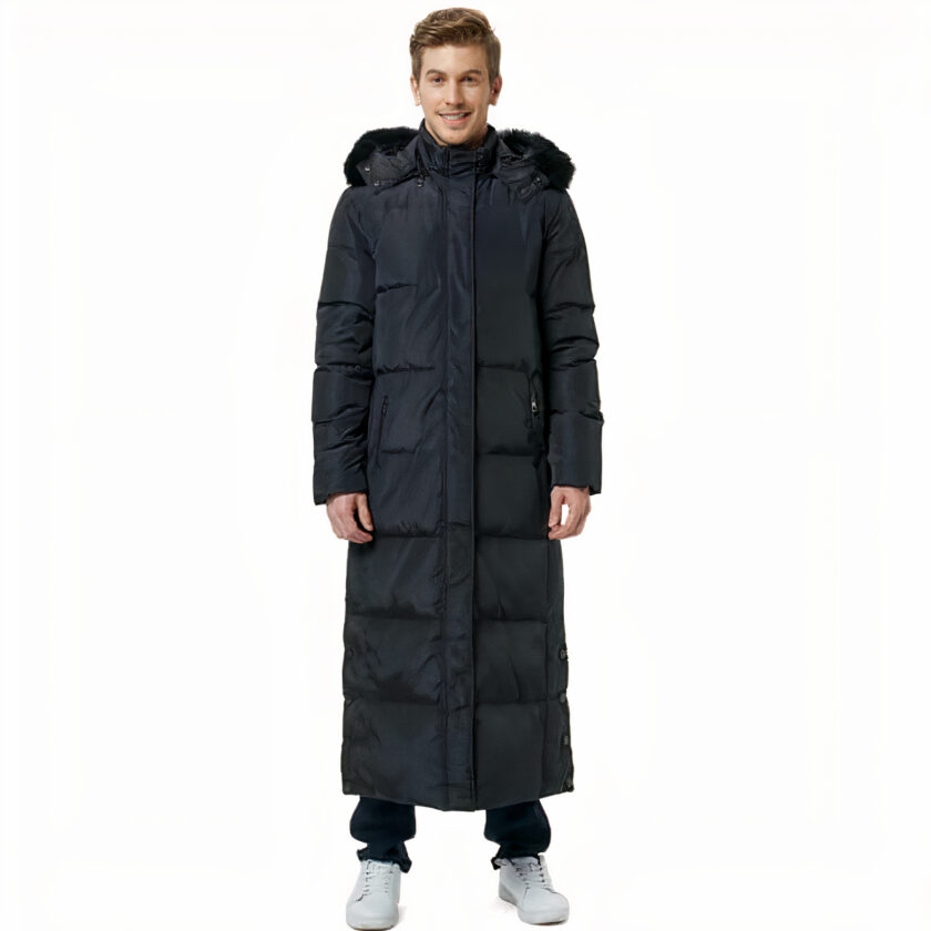 Questo piumino nero da uomo è stato appositamente progettato per offrire la massima protezione contro il freddo estremo. La sua lunghezza estesa alla caviglia offre una copertura completa e un isolamento eccezionale, mantenendovi al caldo dalla testa ai piedi.